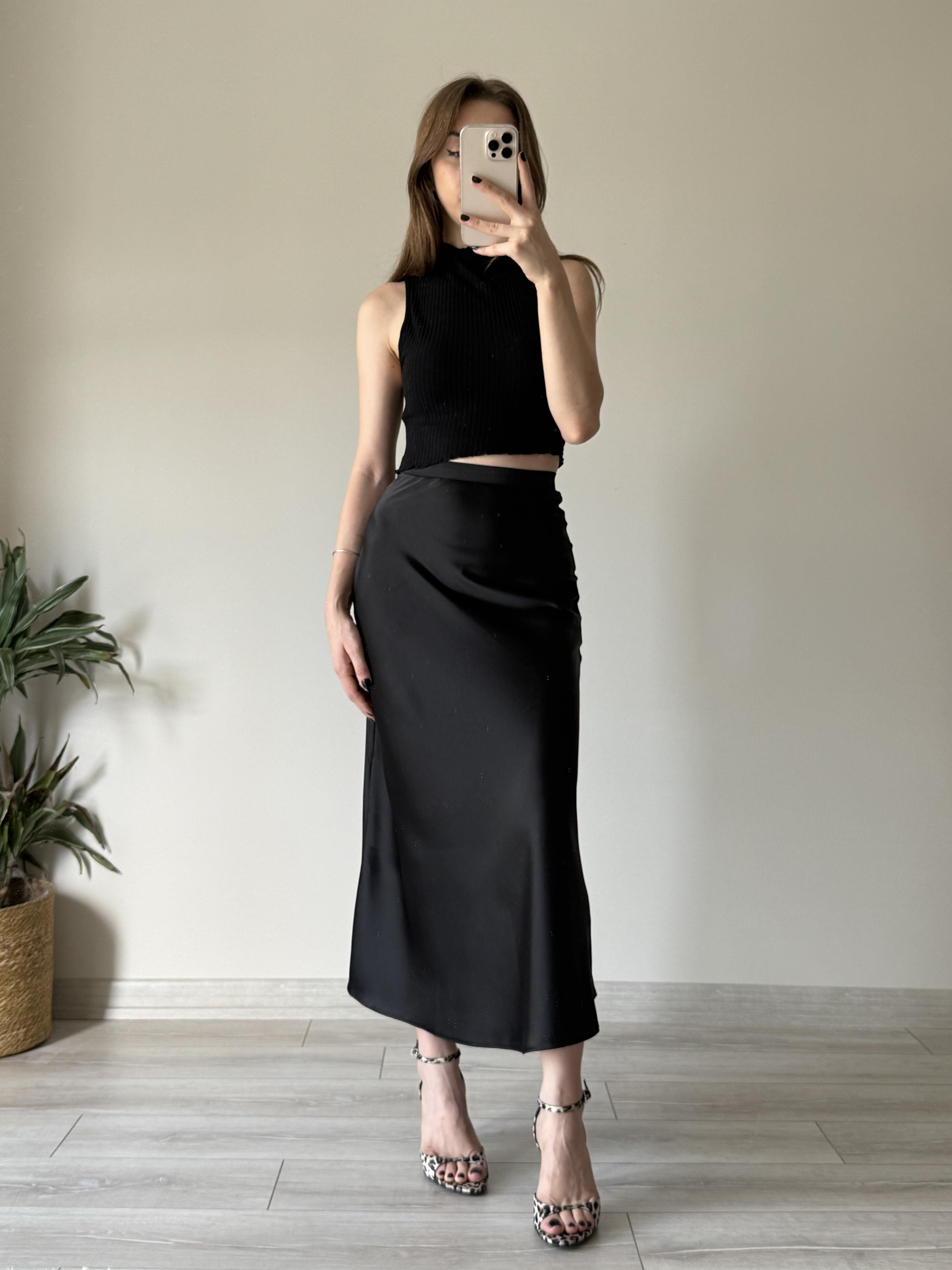 YÜKSEK BEL, YANDAN FERMUARLI SATEN MİDİ BOY ETEK